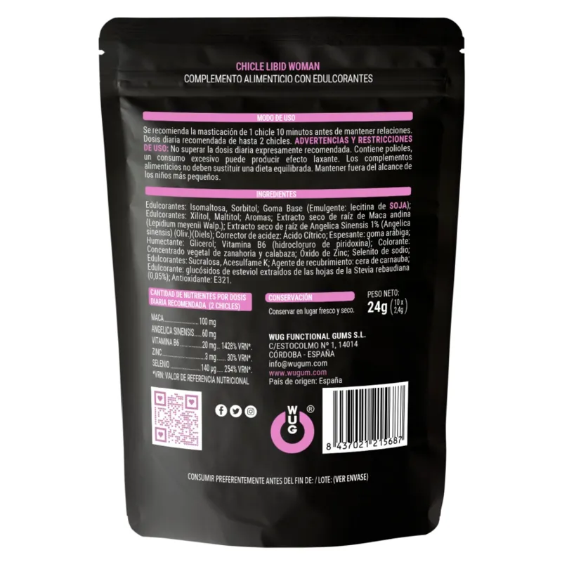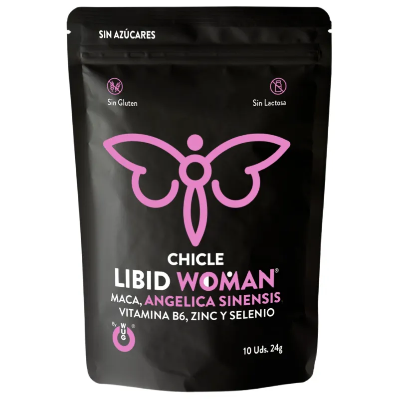 As Pastilha Elástica Libid Woman Wug Gum incorpora 30 mg de ANGELICA SINENSIS, mais conhecida como “Ginseng Feminino” que aumenta os lípidos nas mulheres, potenciando o fluxo sanguíneo na zona vaginal e 1,5 mg de ZINC que aumenta a fertilidade contribuindo para a reprodução normal. Também inclui Maca, Selênio e Vitamina B6.