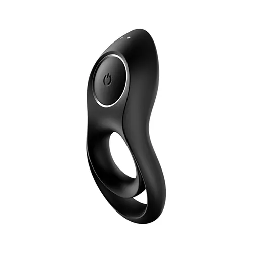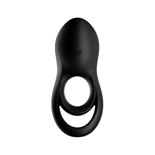 O Anel Vibratório Legendary Duo Preto Satisfyer tem uma cabeça mais fina e ligeiramente curvada. Os seus anéis são grossos e têm o interior achatado. O botão de energia de toque único está localizado debaixo de um detalhe metálico na cabeça vibradora.