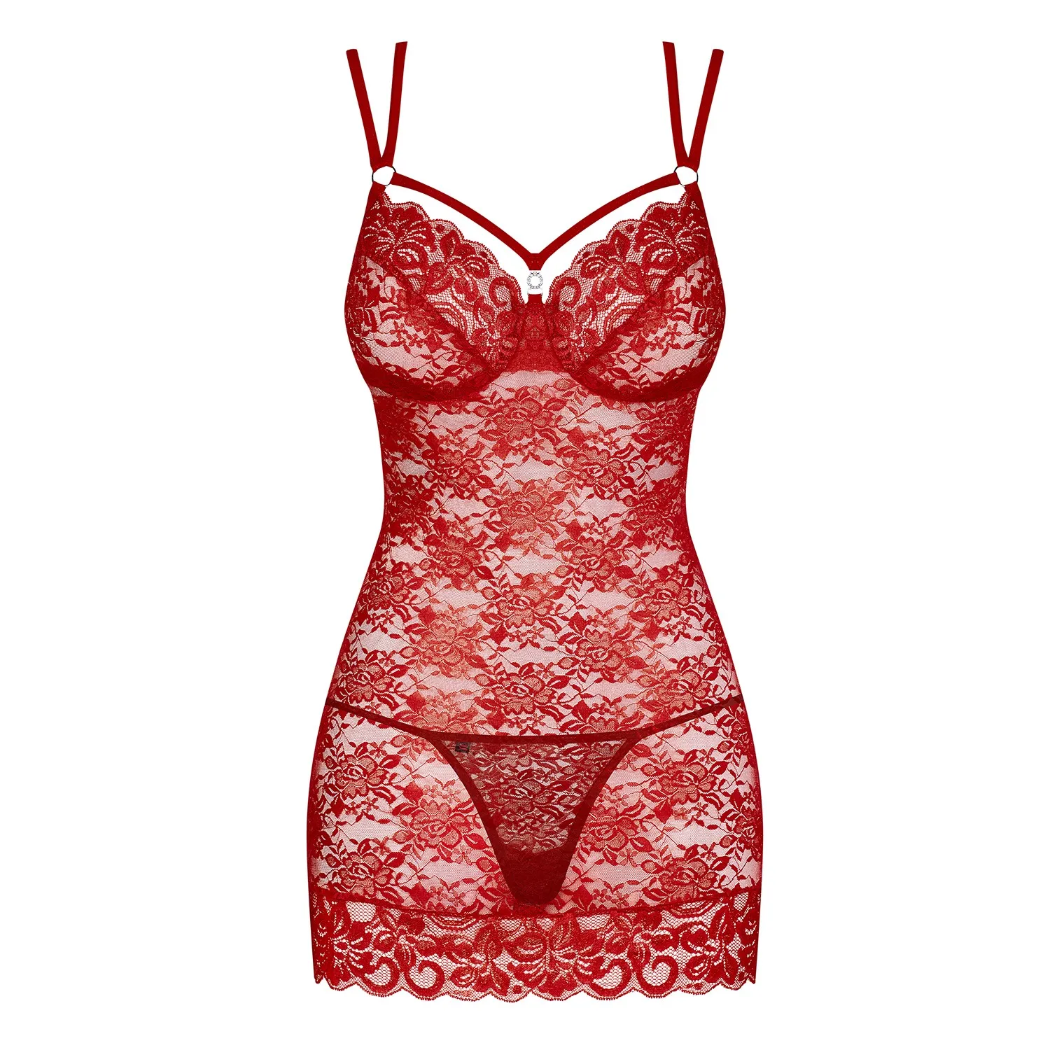 Explore a sua noite e seduza com a Camisa de Noite e Tanga 860-che Obsessive Vermelha, com pormenores em renda de padrão floral e um vertiginoso decote nas costas.