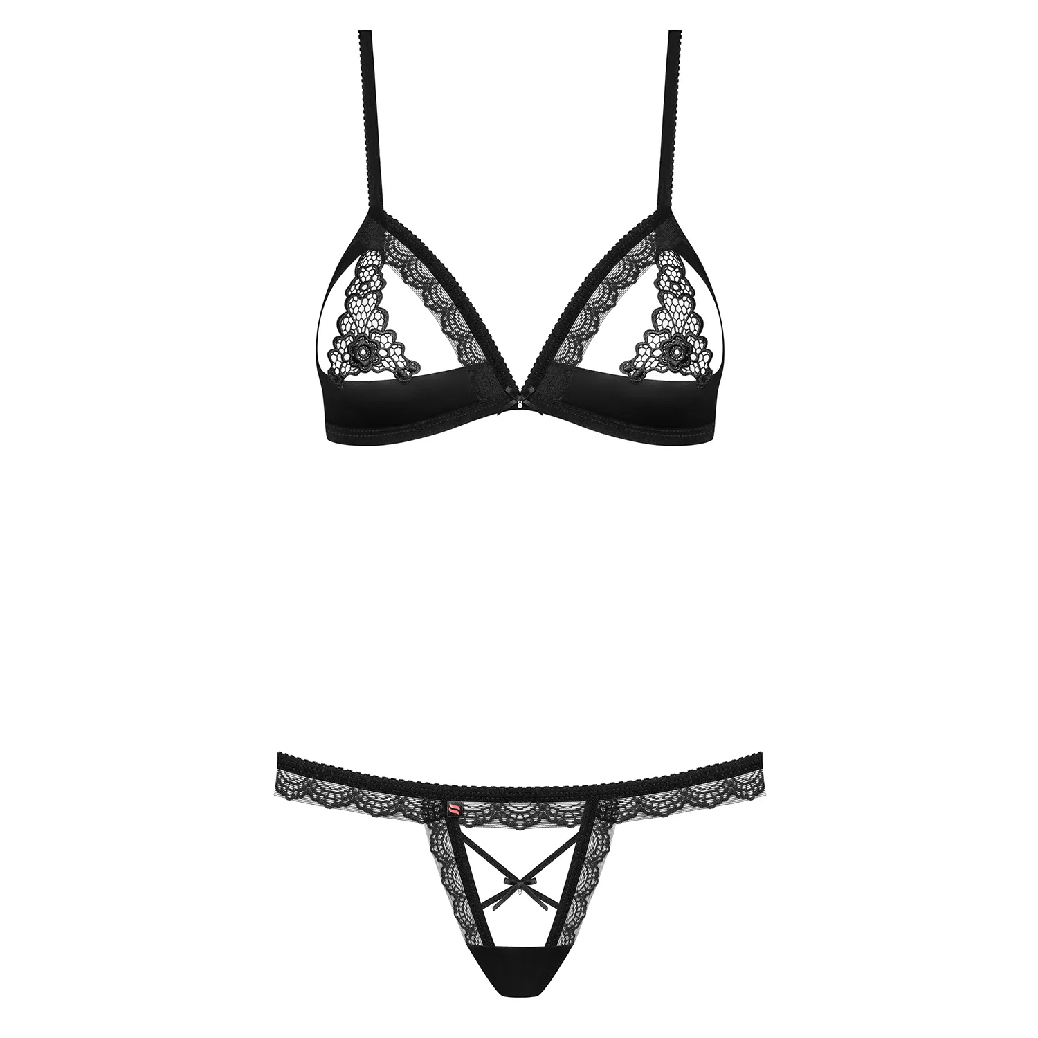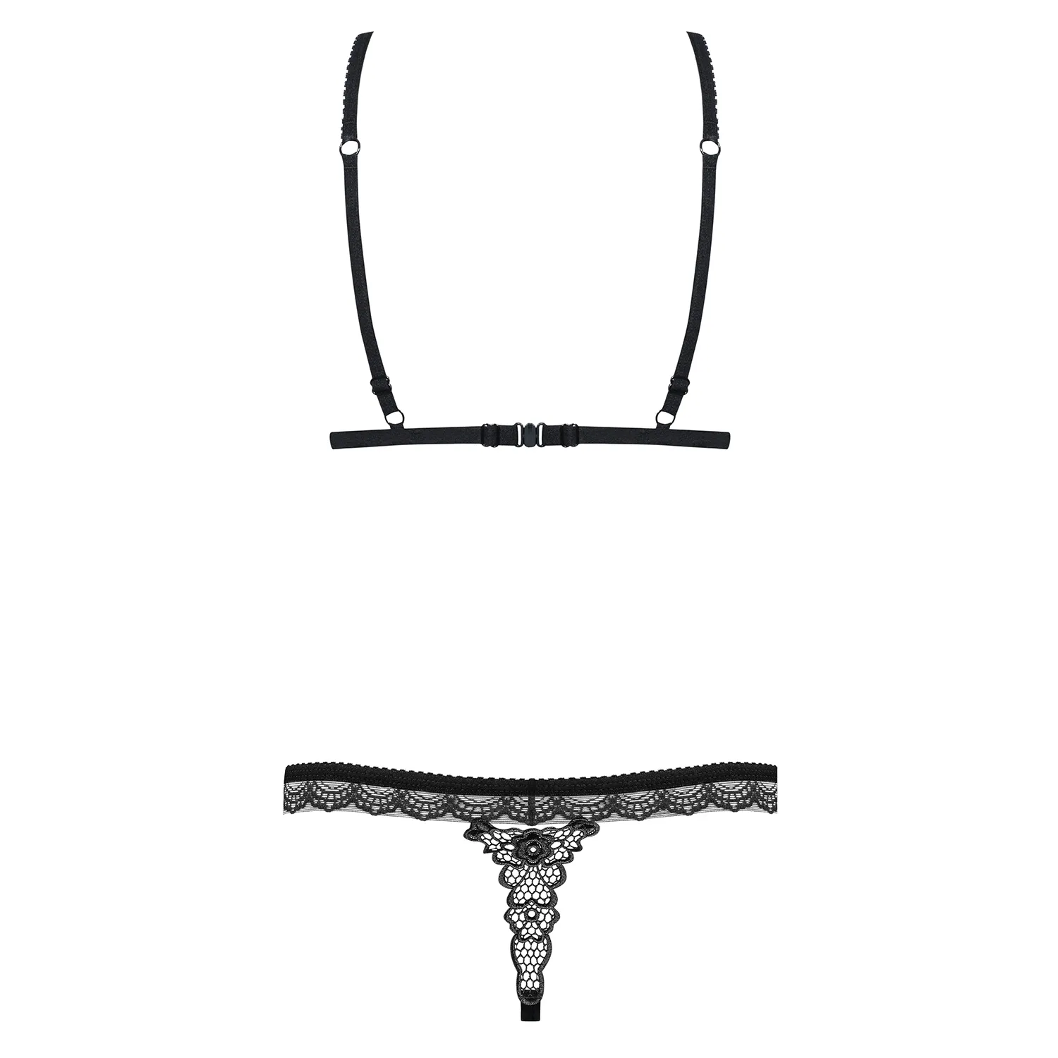 Explore a sua noite e seduza com este sensual Conjunto 865-set Obsessive Preto com pormenores em renda de padrão floral.