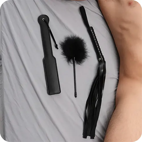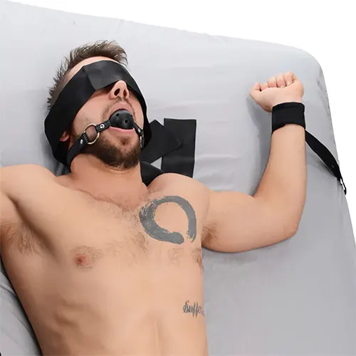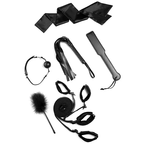 - O Conjunto de 6 Peças para Bondage também vem com todos os acessórios que pode querer ou precisar para se divertir, incluindo uma mordaça clássica respirável, uma venda sedosa para os olhos, um chicote, uma palmatória e um ticker provocante.