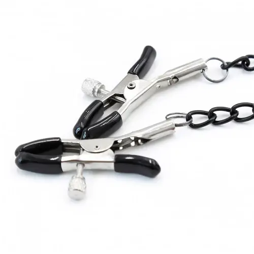 - E para complementar a sua sessão de prazer, incluímos umas pinças para os mamilos. Estas pinças são ajustáveis e têm uma manga na ponta para maior conforto. Estão ligadas à pinça de modo a que cada vez que se mexe a pinça também se mexe, o que lhe dará o dobro do prazer.
