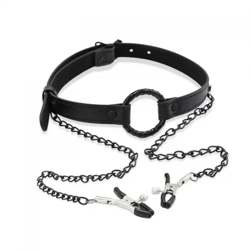Complemente as suas algemas ou colar Intoyou Black Shadow com a Mordaça para Mamilos em Pele Vegana com pinças para mamilos incluídas.