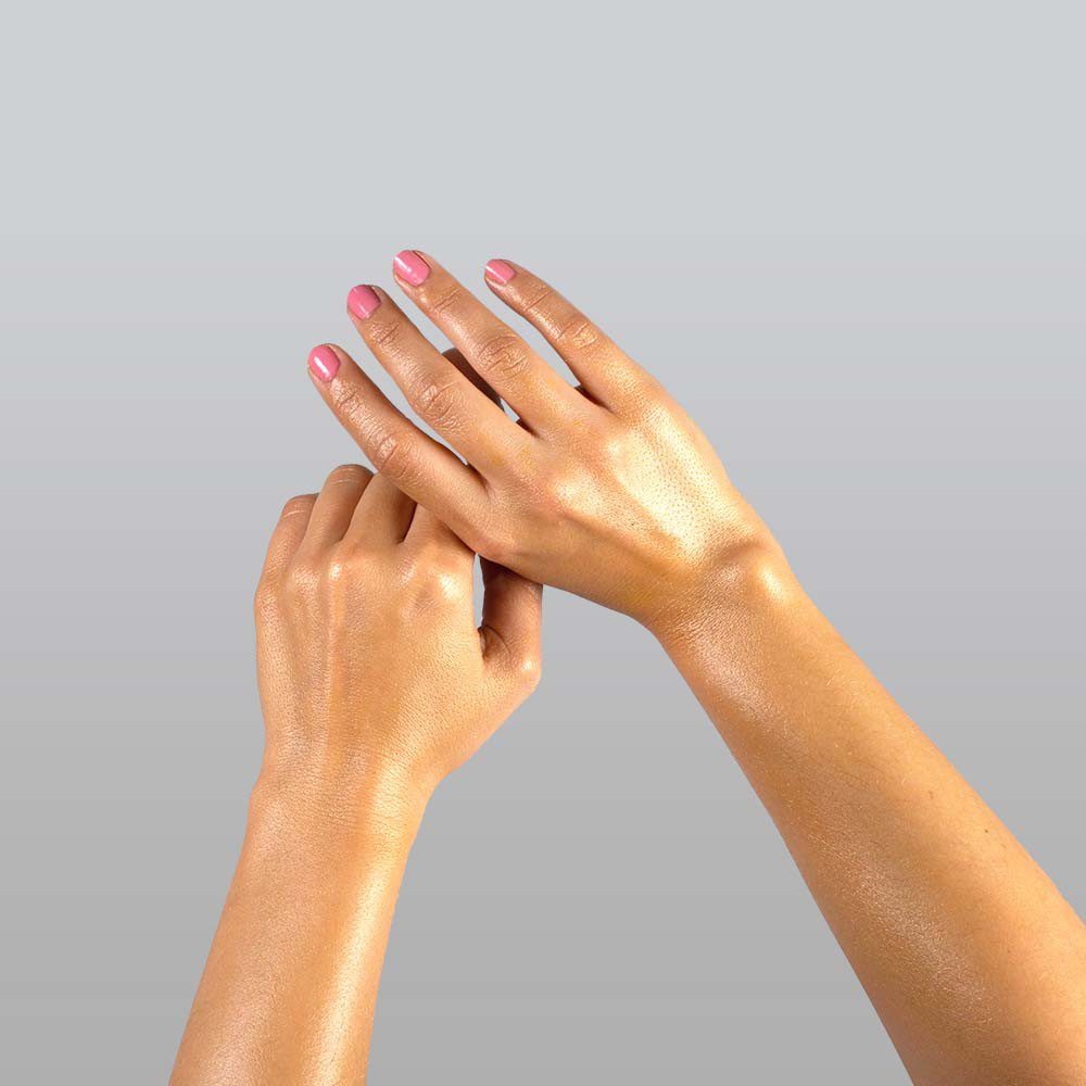 - Aplique uma pequena quantidade na palma da mão e espalhe por todo o corpo com movimentos circulares até ser completamente absorvido. Pronto a brilhar! Para todos os tipos de pele.