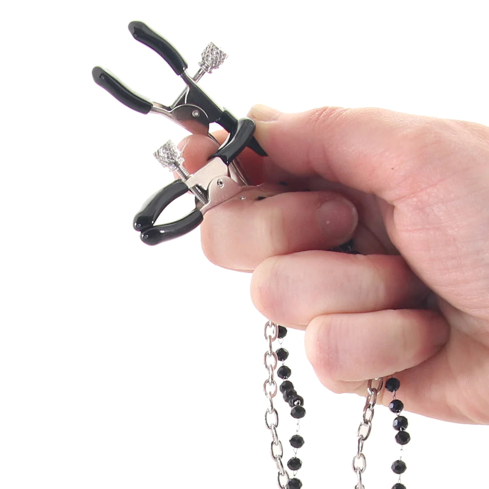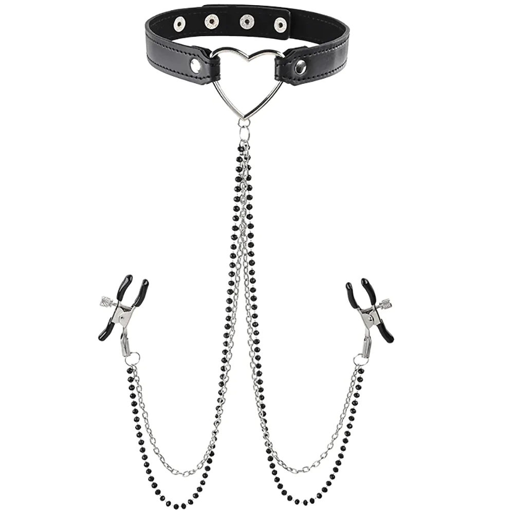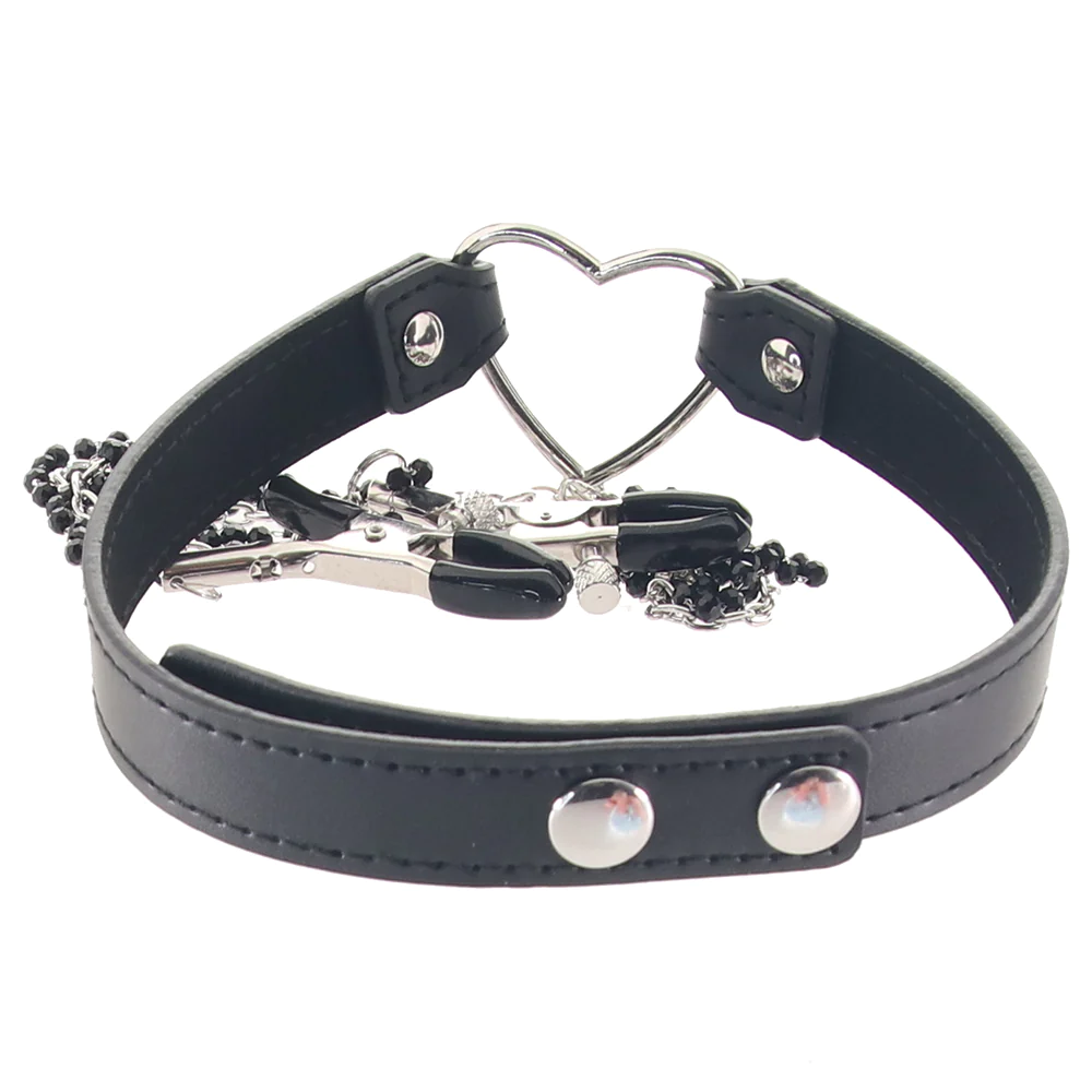 Circundando seu/seu pescoço, a coleira preta de couro sintético fica ótima, mas também oferece um ponto de conexão resistente em forma de coração para uma coleira ou corda, se você estiver com disposição. Dois grampos jacaré ajustáveis clássicos com ponta em borracha preta lisa pendem das pontas de lindas correntes de contas conectadas a esse coração. Os grampos vão puxar e beliscar junto com o movimento, outro impedimento (ou não) contra lutas sensuais.
